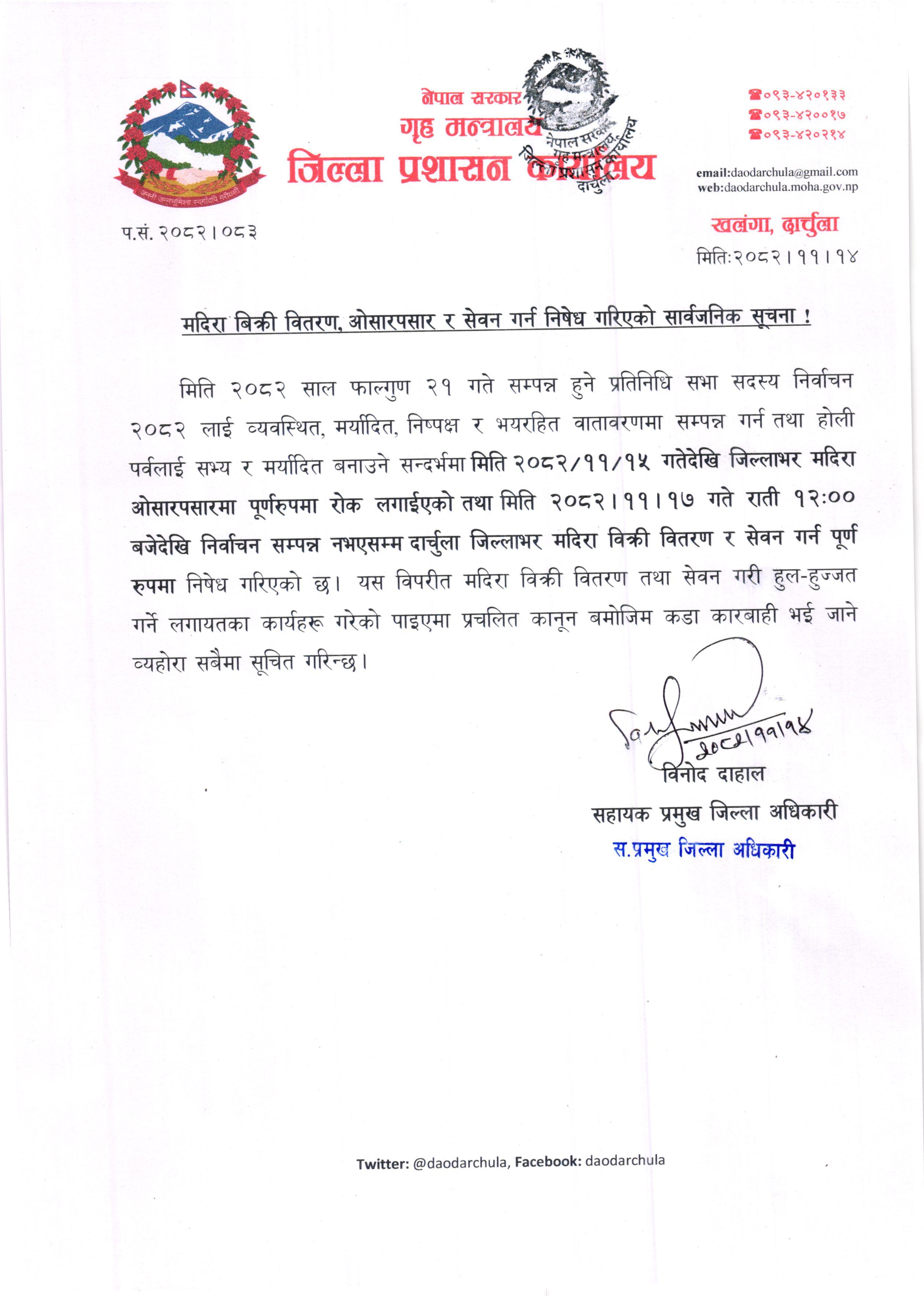 मदिरा बिक्री वितरण, ओसारपसार र सेवन गर्न निषेध गरिएको सार्वजनिक सूचना !