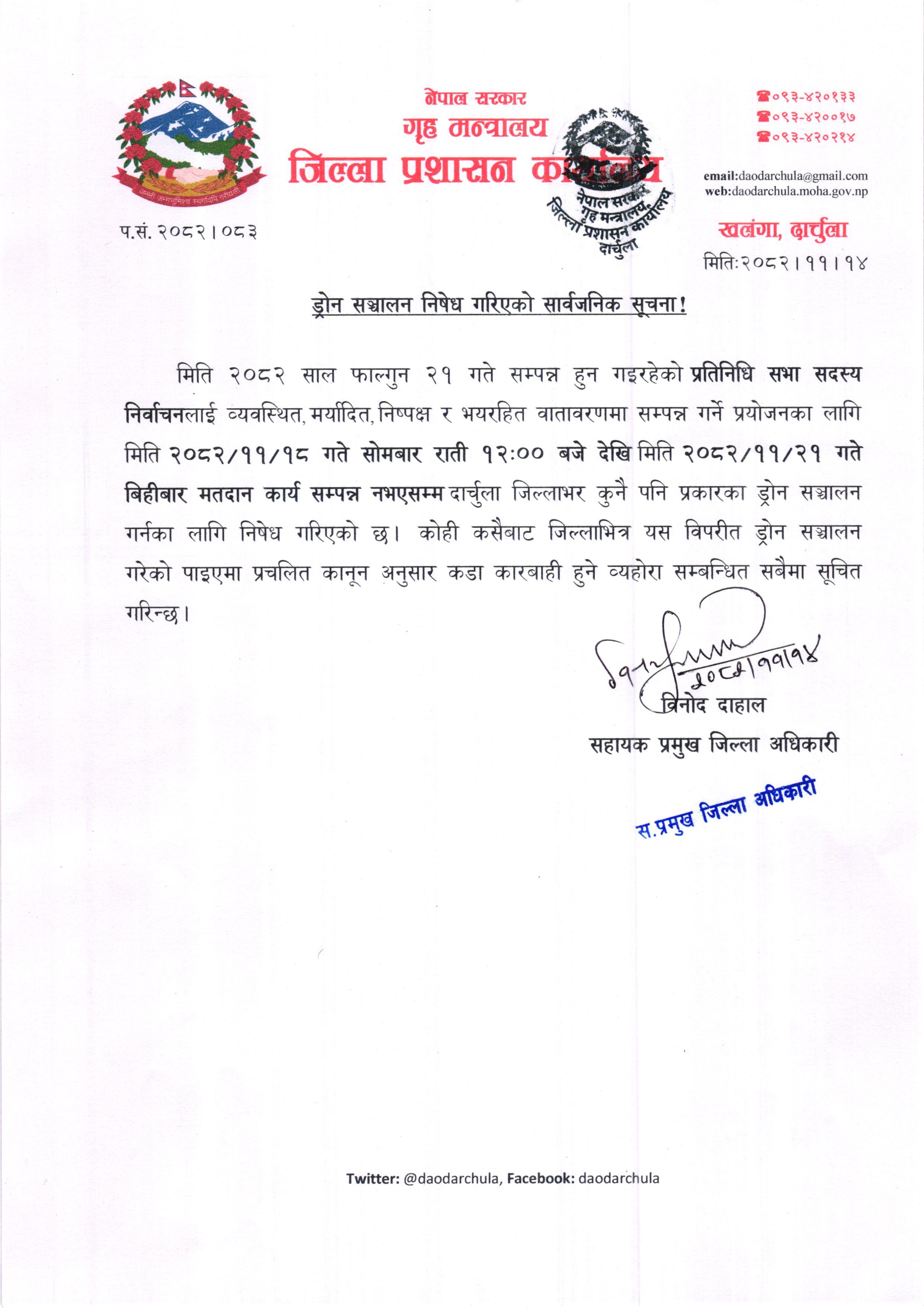 ड्रोन संचालन निषेध गरिएको सार्वजनिक सूचना !