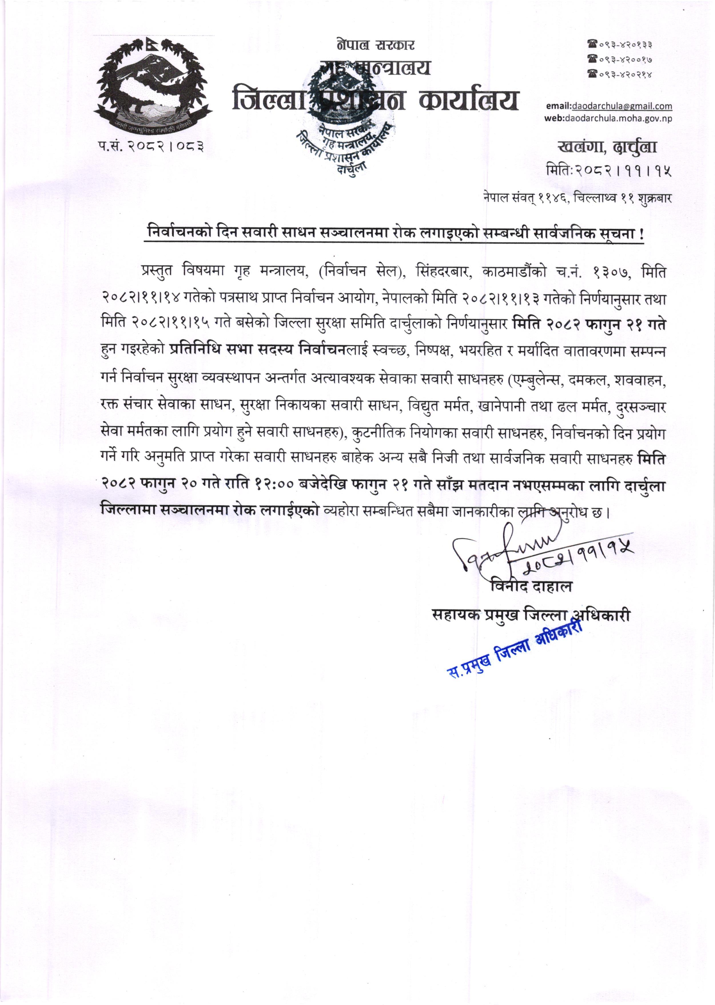 निर्वाचनका दिन सवारी साधन सञ्चालनमा रोक लगाइएको सम्बन्धी सार्वजनिक सूचना !